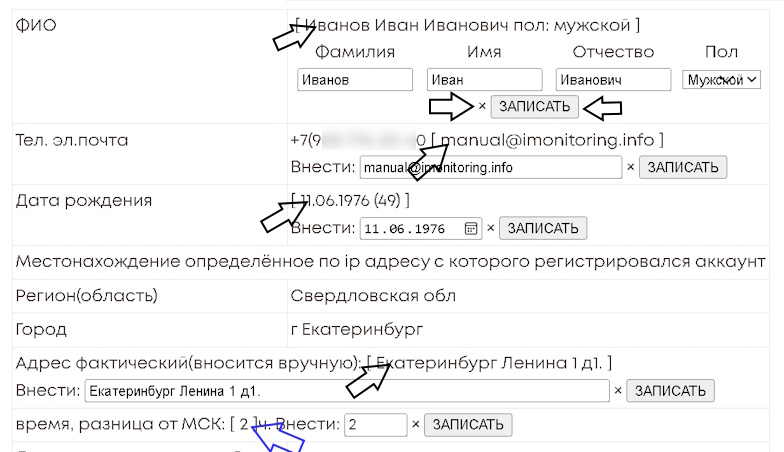 Если данные в приложении не заполнялись, нужно их ввести на сайте. Для этого нужно кликнуть на поле с соответствующими данными, либо пустому, расположенному внутри квадратных скобок [ ]