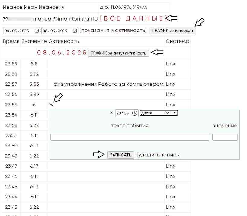 Почему активность загружается отдельно? т.к. мы работаем с копией данных то есть вероятность изменения первичных данных. Данные показаний не изменны, а вот активность (диета, инъекции и т.п.) в приложении Вы вносите сами и можете их редактировать. Так вот если Вы производили редактирование активности в приложении уже после загрузки данных на наш сайт, нужно данные активности удалить с сайта за соответствующую дату (× - рядом) и загрузить их повторно.