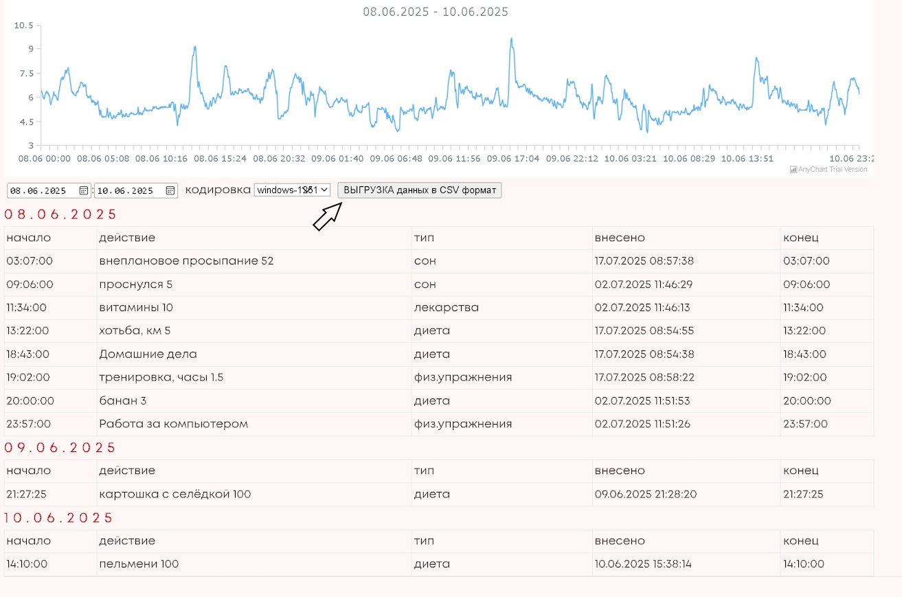 Строка ПРОСМОТР позволяет выводить уже загруженные данные за интервал дат. Из этого отчёта можно строить график как за интервал дат, так и по каждому дню с активностями. Для возврата к загрузке данных жмите [ВСЕ ДАННЫЕ]